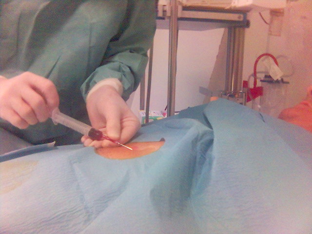 - Chọc vào động mạch vành phải: máu đỏ tươi và đông trong bơm tiêm. Thường lượng máu rút vào bơm tiêm không nhiều, sau đó tắc kim không rút được nữa và không gây rối loạn huyết động nghiêm trọng. Cần rút kim thăm dò ra và tiến hành lại từ đầu sau khi đánh giá lại toàn trạng người bệnh.