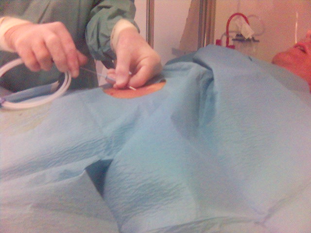 - Khi đã rút kim sắt ra hẳn phía ngoài, người thày thuốc luồn catheter vào lòng ống nhựa và đưa sâu khoảng 15 cm vào trong khoang màng ngoài tim. Sau khi kiểm tra, rút dịch dễ dàng qua catheter thì rút nốt ph