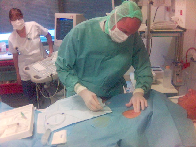 - Sau đó tiến hành sát trùng rộng vị trí chọc dò trên lồng ngực bệnh nhân, trải săng vô khuẩn, bác sĩ rửa tay, mặc áo, đi găng vô khẩn, bắt đầu thực hiện thủ thuật.